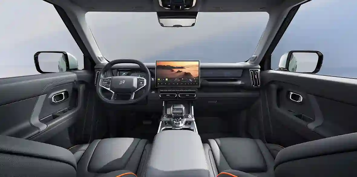 Интерьер JETOUR T1 продуман с точки зрения эргономики и качества материалов. Перфорированные текстурированные сиденья Shuyun («комфорт, как на облаке») выполнены из гипоаллергенных приятных на ощупь материалов. Спортивный руль, рычаг переключения передач в авиационном стиле, цифровая приборная панель 10,25 дюймов, 12,8- или 15,6-дюймовый центральный экран управления обеспечивают максимальное удобство эксплуатации. На передней панели со стороны пассажира органично интегрировано изображение карты мира. Водитель и пассажиры могут рассчитывать на высокий уровень комфорта благодаря увеличенному пространству в салоне, а панорамная крыша визуально делает его еще просторнее и светлее. В салоне предусмотрено 45 отсеков для хранения, а объём багажного отделения достигает 1 455 литров при сложенных сиденьях второго ряда.